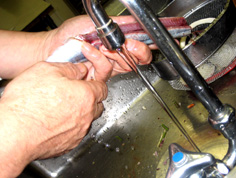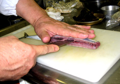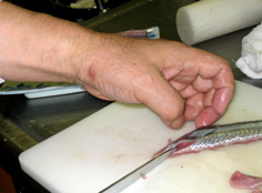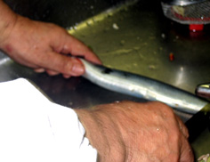 次に尾の方の皮に刃を軽く当てて、端を少し引いてから、今度は左手で皮を引っ張りながら包丁の峰でしごくようにする |