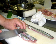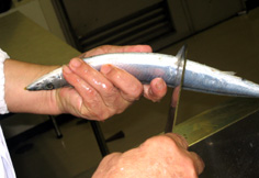 秋刀魚のお腹を上にして、肛門から頭に向って包丁を入れて切る。中骨にあたるまで深く入れる |