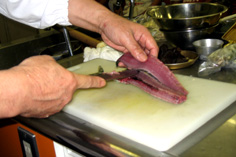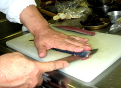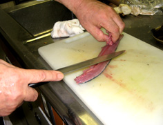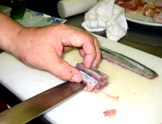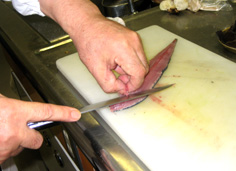 真ん中に小骨があるので、骨に沿って左側に包丁を入れる。あまり深くすると身が切れるので途中くらいまで |