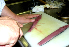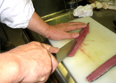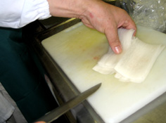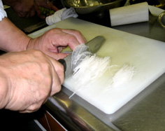 それを横にして、端から極く細く切る。この切り方は「横づま」と呼ぶ |