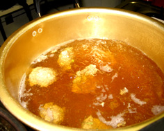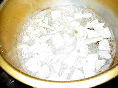 鍋にだし汁を沸かし、薄口醤油、塩、酒で好みの味をつけ、良く沸いたところにすり身を落として行く |