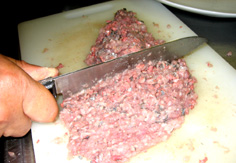 秋刀魚は三枚におろし、小骨と皮を引いたものを包丁で叩く |