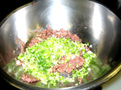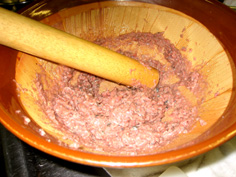 全体を良く混ぜてから、卵と片栗粉をつなぎに加えて、さらに良く混ぜる(写真は卵が早すぎ) |