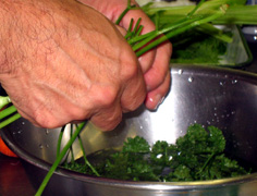 パセリは軸を取り、葉はみじん切り。軸は後で使う |