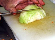 横から根元にむけて包丁を入れる(切り落とさないように) |
