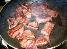 しっかり焼色を付けることが、仕上がりの香り、味、色の素になる。皿に肉を取る。フライパンはそのままに |