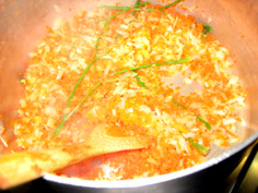 弱火でじっくり炒める。水分を飛ばして野菜の甘みと旨みを引き出す。 |