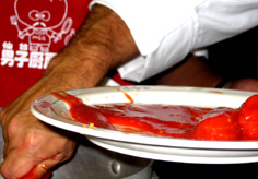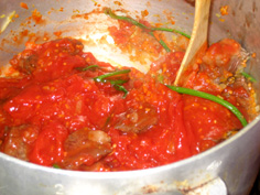 ホールトマトは手で潰しながら入れ、汁も加える |