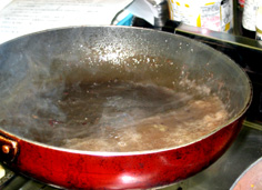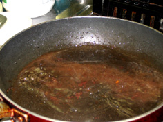 泡立つ位の火で煮つめる。水分の蒸発とともに残った小麦粉と油が溶け合ってトロトロになる。肉の鍋に加える |