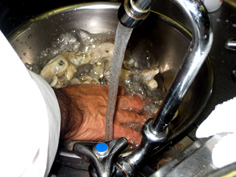 オイスターは、さっと洗い、汚れと殻を取る |