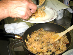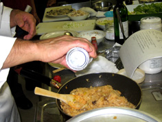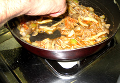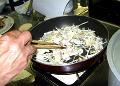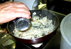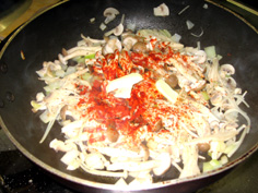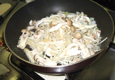玉ねぎが透きとおってきたら茸類を入れる |