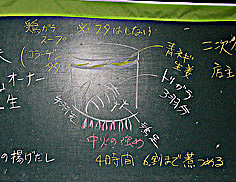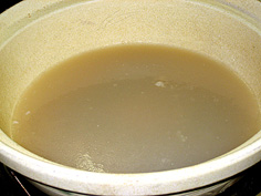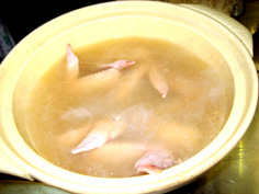 鶏のスープの作り方 5リットル位の水に、手羽先、鶏足(もみじ)、鶏がら3羽分、青ネギ、生姜を入れ、沸騰したら中火の強めで4時間ほど 煮込む。ゴトゴト音がする位でフタはしない。最初のアクと、途中で浮いた脂をとる。 |