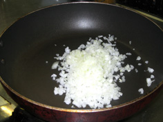 油を引かないフライパンに玉ねぎを入れる(フライパンは熱くしないで。熱い所に入れると玉ねぎが苦くなる) |