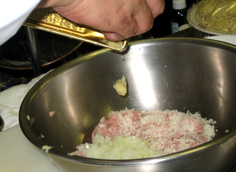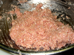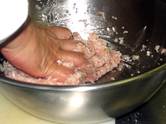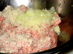 ボールに鶏挽き肉、酒炒りした玉ねぎ、生パン粉 |