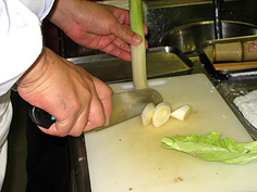 仙台名物の曲がりネギは横にすると切りにくいので、このように立てて切る |