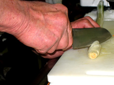 そのまま回転させて下を上にし、同様に斜めに切る。切り落とさないように |