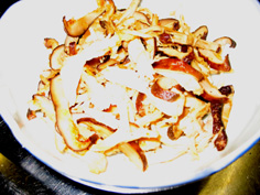 鶏ささみと椎茸を軽く炒め、合わせておいた調味料少々で味をつける |