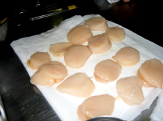 貝柱だけを取り出し、脇の硬い部分を取り除き、水気を拭く |