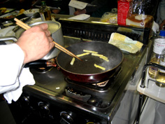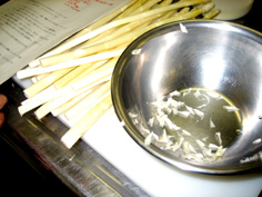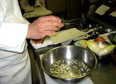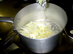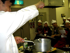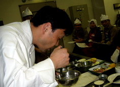 ここで塩を少々入れる。石川先生「この塩は野菜の旨みを引き出す大切なもの。忘れずに!!」 |