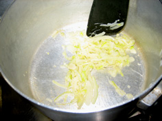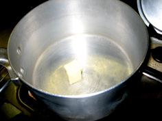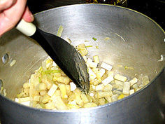 バターが半分ほど溶けたらねぎを炒め、バターが全体にまわったら玉ねぎを加えて弱火で焦がさないよう(色も付かないように)炒める |