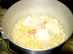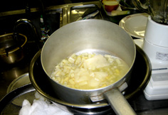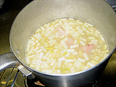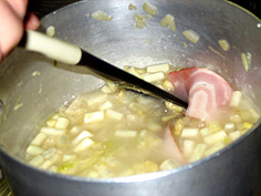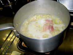 水300ccとベーコンを入れる。ベーコンはダシの役目をする(ミキサーに入れる前に取り除く) |