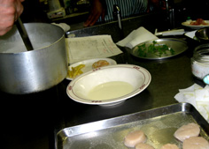 ソテーしておいた帆立の貝柱とホワイトアスパラの穂先をのせ、皿の周りを綺麗にふく |