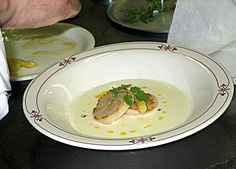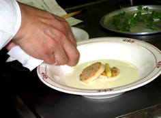 セルフィーユを飾り、黒粒こしょうを散らし、エクストラバージンオイルを周りに水玉のように流す |