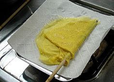 | 弱火で焼いて箸を真ん中に入れ | 持ち上げて返し反対側も焼く | ペーパにとって細く切る | ||||