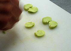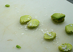 | サラダ油を少しづつ入れ卵の素を作る | マヨネーズ状にし海老と合わせる | 空豆の皮をむき半分に開いておく | ||||