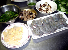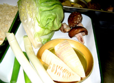 材料 4人分 小エビ 300g ふくろ茸 50g 生椎茸 3枚 チンゲン菜 1株 たけのこ 50g 長ネギ 1本 ※写真のキャベツなどは違う料理の食材 |