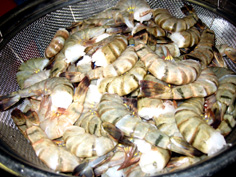 海老は背わたを取り、殻を剥いてから塩でもみ、水洗い |
