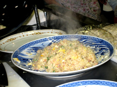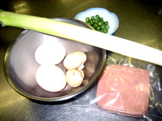 材料 5人分 御飯 5杯分 ハム又はチャーシュー 100g マッシュルーム 30g 卵 4個 長ネギ 1本 グリンピース 30粒 調味料 塩 小さじ1と1/3 醤油・酒・コショウ 各少々 |