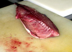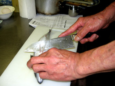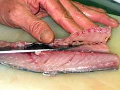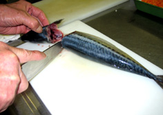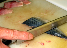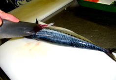 鯖は三枚におろす。最初に身を立てて、腹びれに軽く包丁をあてる |