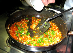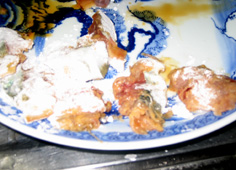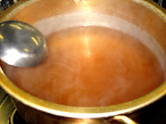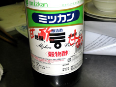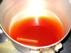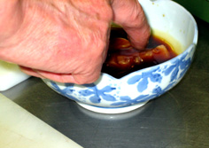 ここでは先生の店の甘酢を使用。酢と砂糖同量に、みりんが酢の1/5の量。塩少々、鷹の爪1本を鍋に入れ、煮詰めている。これに 料理に合わせて酢など えて調節している。 |