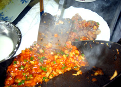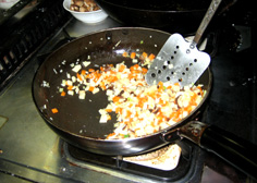 フライパンに油をひいて、にんにく、しょうが、ネギを炒め、香りが立ったら筍、人参、椎茸を加えて混ぜる |