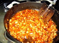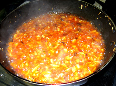 炒めた具に油が回ったら合わせておいた調味料を入れ、にんじんが柔らかくなるまで煮る。途中、火は中火弱にして。 |