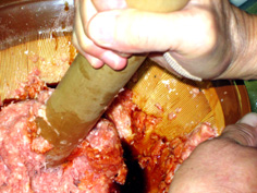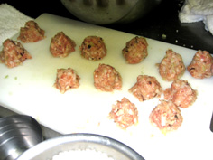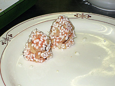 もち米を団子にまぶす |