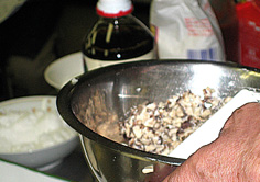 すり鉢の挽肉に、玉ねぎ、椎茸を入れる |