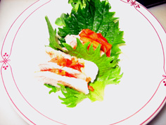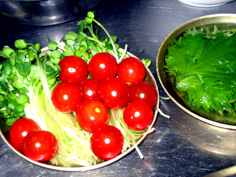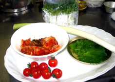 白菜キムチ 100g しその葉 8枚 プチトマト 8個 貝割れ菜 適量 (写真のネギは上の豚ばら肉用) |