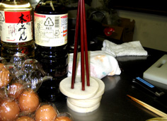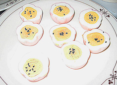 材料 5人分 玉子 3個 茹でる時の塩 適量 大根(厚さ1cmの輪切り) 1枚 輪ゴ 1本 丸箸 5本 食用食紅 適量 黒しおごま 少々 |