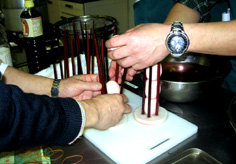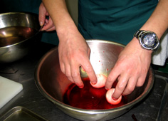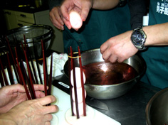 丸箸を大根に5角に刺し、食紅のついた玉子を水で軽く洗い、箸の間に入れる |