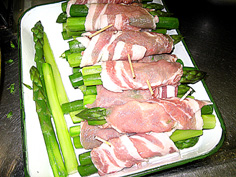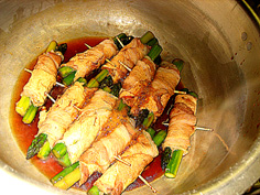 材料 5人分 豚ロース薄切り 5枚 アスパラガス(下の固い皮をむく) 5本 妻楊枝 5本 ※調味料 醤油・みりん・砂糖 各大さじ2 |