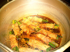 豚肉を巻いて妻楊枝でとめる |