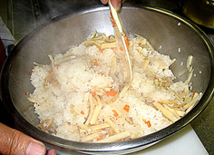 材料 5人分 竹の子(下の部分) 100g にんじん(正味)20g 油揚げ(小揚げ) 1枚 もち米(前の晩から水に浸しておく) 2、5合 ※調味料 薄口醤油 45cc みりん 30cc 砂糖 小さじ山盛り1 水 50cc |