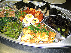 お弁当の完成。奥は竹の子おこわを握り、のりを巻いたもの。時計回りに、茄子のオランダ煮、鶏肉のみぞれ煮、春菊のきんぴらと胡麻和え、豚肉のアスパラ巻き、真ん中が竹の子とタラの芽の南蛮揚げと花玉子 |