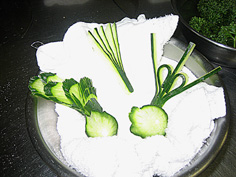 飾りきゅうり等で見た目も綺麗に。完成!! 奥が山で次に里があり、手前の海に流れるイメージを描いて盛り付けると美しい!! |