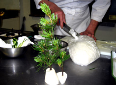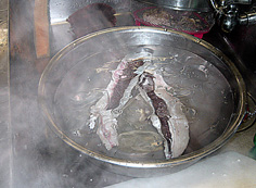 鍋にお湯を沸かし、鯛の身を湯引きする。実際にはここでガーゼ等の布をかけた上からお湯をかけるが、状態を分からせるために、直接かけている。たっぷりの氷水を用意 |