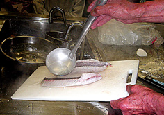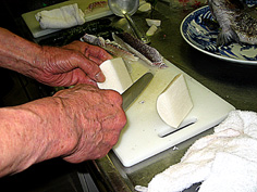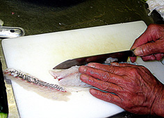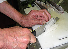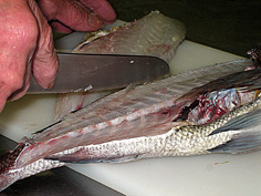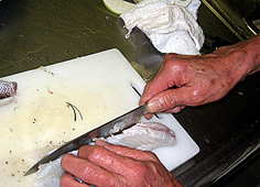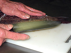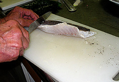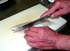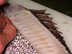 身の中心の小骨のあるところに、両側から、まっすぐ包丁を入れ、小骨を取る |