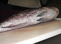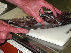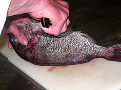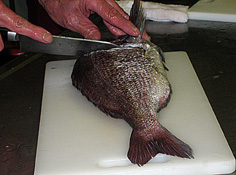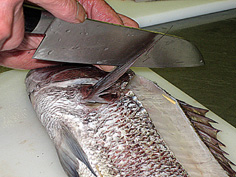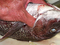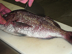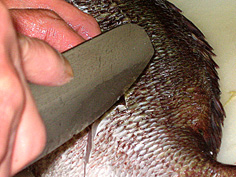 頭を左、お腹を向こう側に置き、お腹のところを7~8センチ切る。こうすると鯛の表面に傷が出てこない |