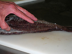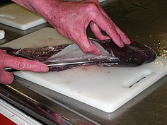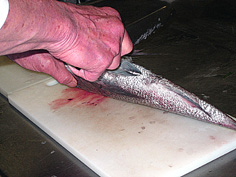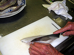 こんどは反対の背の方に包丁を入れる。この時、尾の付け根に横に軽く切れ目を入れておく |